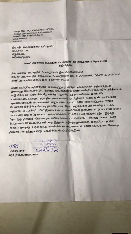 எதிர்வரும் 20/01/2026 ( புதன்கிழமை ) காலை ஒன்பது மணிக்கு யாழ்ப்பாணம் தீவகம் வடக்கு ஊர்காவற்துறை பிரதேசசெயலர் பிரிவில் எழுவைதீவு J/39 கிராம அலுவலர் பிரிவில் காளவாடியடைப்பு என்ற இடத்தில் பொதுமக்களுக்குச் சொந்தமான 53 பேர்ச்சஸ் அளவுள்ள காணி சிறீலங்கா கடற்படையின் எலரா படையணி முகாம் அமைப்பதற்காக நில அளவைக் காரியாலயத்தினால் சுவீகரிப்படவுள்ளது.