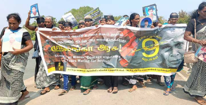 குறித்த போராட்டமானது ஒன்பது ஆண்டுகளைக் கடந்துள்ள நிலையில் சர்வதேச மகளிர் தினமான நேற்று மகளிர் தினம் எமக்கு துக்க தினம் என தெரிவித்து தமக்கு சர்வதேச விசாரணையே தீர்வு எனக் கோரி போராட்டத்தை முன்னெடுத்தனர்.